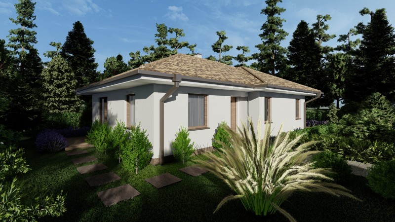 Tento dom má celkovo 2 obytné miestnosti. Vyznačuje sa svojou jednoduchosťou dispozičného riešenia. Obývačka je spojená s kuchyňou a zároveň aj s jedálňou. Dom je určený pre 3 člennú rodinu.