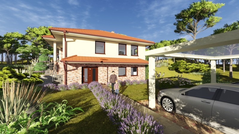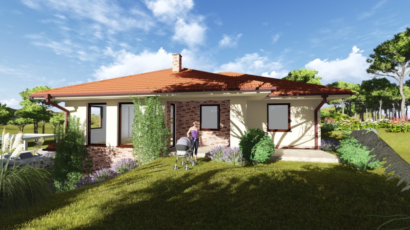 Jedná sa o štandartný typ 5 izbového bungalovu. Stavba je realizovaná na svahovitom pozemku, preto je čiastočne podpivničená. Može byť ale realizovaný i na rovine. Dispozične je maximálne efektívne využitý, delený na nočnú a dennú časť. Je určený pre 4- člennú rodinu. Minimálna šírka pozemku je 15,5 m.