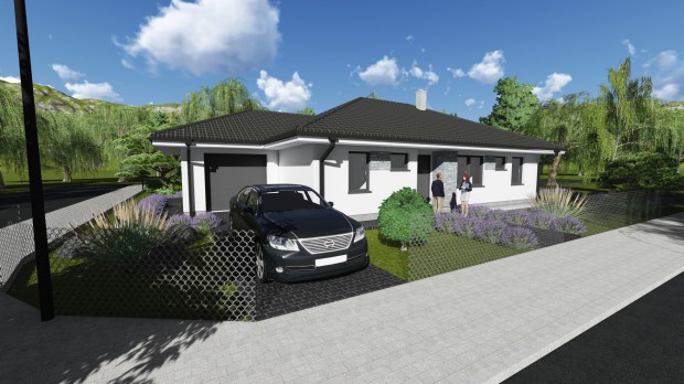 Originálny a priestranný 3 izbový bungalov s garážou. Projekt sa vyznačuje svojím dispozičným riešením, delením na dennú a nočnú časť.Vchod do domu je riešený z prednej strany a obývacia izba + 2 samostatné izby majú riešený výstup na terasu , ktorá je na zadnej strane.