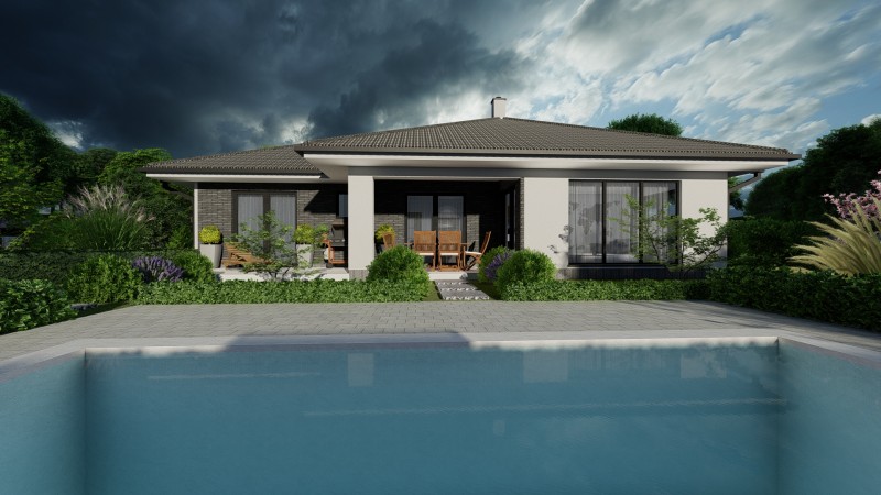 Tento projekt má celkovo 3 obytné miestnosti. Kuchyňa je spojená s jedálňou čím vytvára viac priestoru. Obývačka je čiastočne oddelená. Dom je ideálny pre 4 maximálne 5 člennú rodinu.